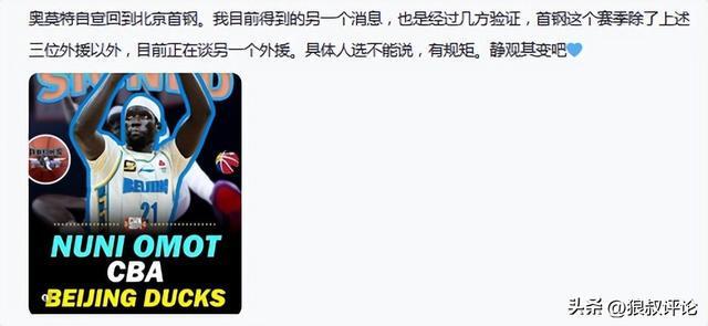 值得一提的是此前有媒体报道,北京首钢已经确定与上个赛季锋线外援奥莫特续约,是否意味着曾凡博回归存在不确定因素,相信是外界关注的焦点。