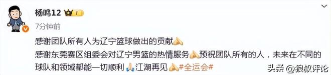 杨鸣赛后更新社媒告别全运会:感谢团队所有人为辽宁篮球做出的贡献。