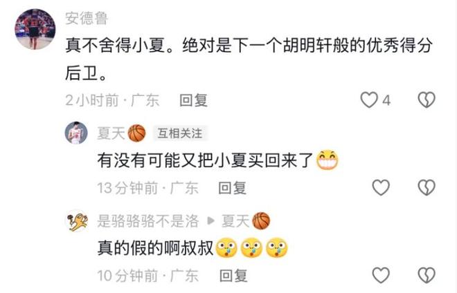 事情是这样的。打完首场全运会比赛后,夏振峰的父亲在社交媒体上发布了夏振峰的比赛集锦,引发了不少广东球迷的关注。其中有广东球迷留言,表示舍不得小夏,他会是下一个胡明轩般的优秀得分后卫。对此夏振峰的父亲夏天在下面回复:“有没有可能又把小夏买回来了”,并附上了一个呲牙笑的表情。夏天的回复引发了不少广东球迷的关注,不少球迷纷纷称赞朱芳雨,认为他今年夏天真的可以封神了,连续几次交易都是神操作。更有球迷表示,朱芳雨下班后可以多喝两瓶!
