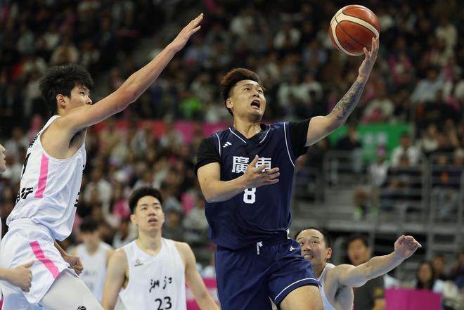 11月12日,广东东莞,全运会男篮决赛中,广东队球员赵睿(右)在比赛中突破上篮,最终广东队101-65大胜浙江队。中国日报记者 魏晓昊 摄