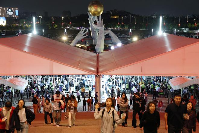 11月12日,广东东莞,全运会男篮决赛开始前,大批观众持票入场,当晚的比赛座无虚席。中国日报记者 魏晓昊 摄