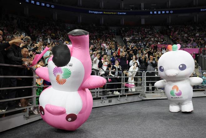 11月12日,广东东莞,全运会男篮决赛开始前,“喜洋洋”“乐融融”为观众呈现精彩表演,“耍宝”动作一度蹿红网络。中国日报记者 魏晓昊 摄