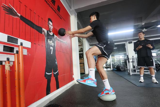 11月12日,广东东莞篮球学校,曾征战NBA的崔永熙在体能教练的带领下训练,背景墙上的林书豪成为了新生代运动员追逐的目标。中国日报记者 魏晓昊 摄