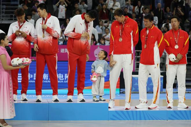 11月12日,广东东莞,在全运会男篮决赛后的颁奖仪式上,获得铜牌的四川队球员周琦(右三)带着儿子一起登上领奖台,孩子好奇地望向广东队的金牌。中国日报记者 魏晓昊 摄