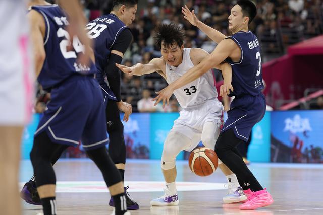 11月12日,广东队球员赵睿(中)防守浙江队球员陆文博(右一)。中国日报记者 魏晓昊 摄