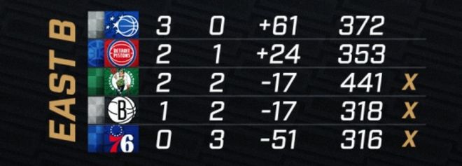 东部B组:凯尔特人、篮网、76人提前出局,魔术和活塞还有晋级希望。