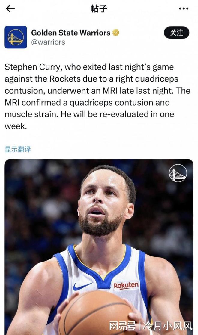 前天,在勇士100:104不敌火箭的比赛中,勇士当家球星史蒂芬库里在制造火箭后卫阿门汤普森进攻犯规时重摔在地,表情十分痛苦的缓了许久。随后,尽管库里强撑着打了几个回合,但比赛最后时刻,疼痛和不适感让库里无法继续坚持,随即返回了更衣室、提前退赛。昨日,勇士官方宣布,经过详细的核磁共振检查,库里遭遇的是没有结构性损伤的右侧股四头肌拉伤和挫伤。